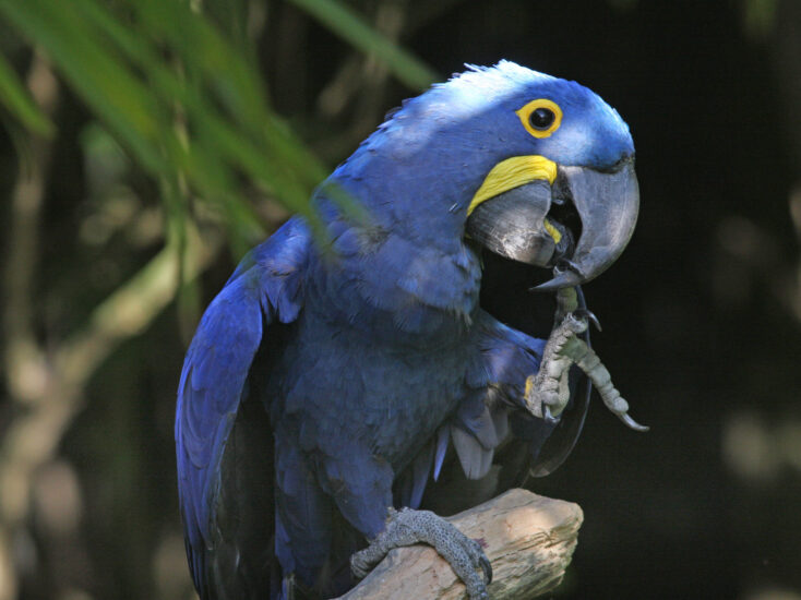 Comment parler d’explosion de couleurs sans évoquer les Aras, et plus précisément le Ara Hyacinthe, reconnaissable à son plumage bleu-cobalt, et son pourtour d’œil jaune vif.